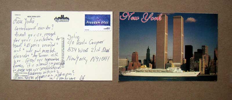 Chere julie, Comment vas-tu? thank you so much for your invitation to rad "Algeria unveiled" and "war and mental disorder" by Fanon wiht you. Given our repressive times, it is almost impossible to to excersize our constitutional freedoms without a certain degree of paranoia., n'est-ce pas? je t'embrasse RG CARD WAS ACCEPTED AND DELIVERED BY US POSTMASTER