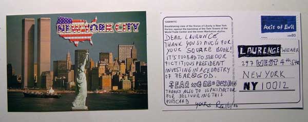 dear laurence. thank you so much for your square book! it's too bad to see our tictitious president investing in a geometry of fear & god. Fear and god = Bush. thanks also to US postmaster for delivering this postcard. yours rg 1