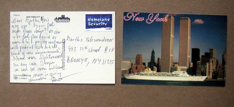 Dear Martha, How are you? Do you feel save these days? or do you feel paranoid or even a bit guilty confronted with patriot acts and all kind of new departments. I have even nightmares! in any case I hope we can see soon and have some more inspiring discussions. rainer CARD WAS ACCEPTED AND DELIVERED BY US POSTMASTER