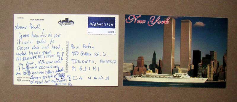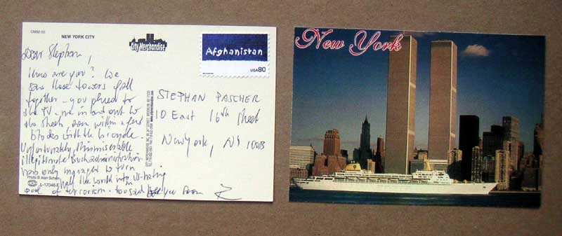 Dear Stephan, How are you? We saw these towers fall together - you glued to the TV - me in and out to the streets, even within a few blocks with the bicycle. Unfortunately, this miserable illegitimate Bush administration has only managed to turn half the owrld into an US-hating pool of terrorism .. too sad . see you soon R CARD WAS ACCEPTED AND DELIVERED BY US POSTMASTER