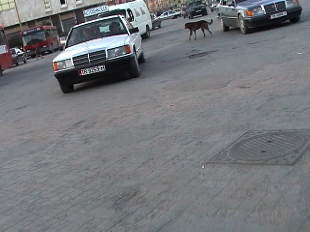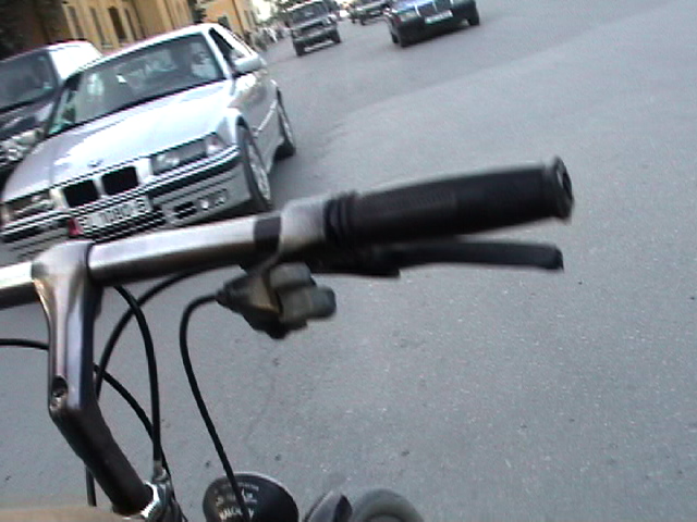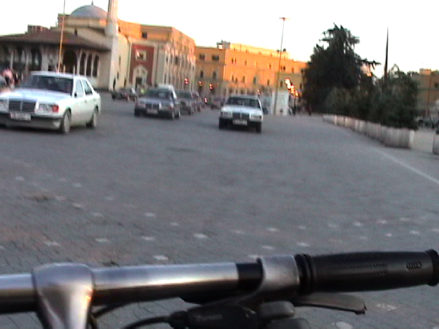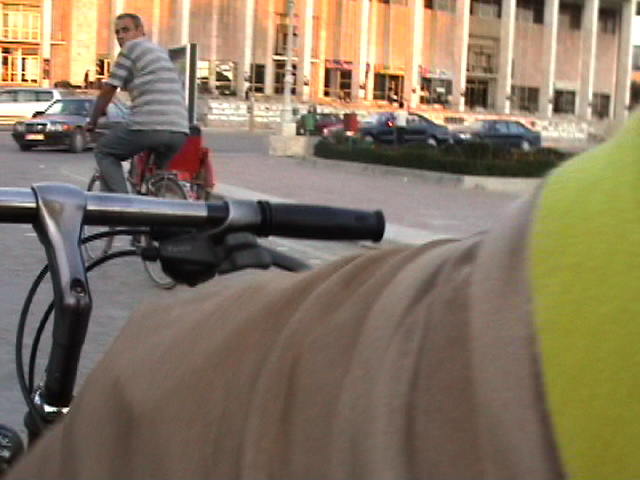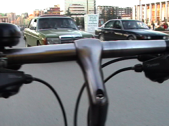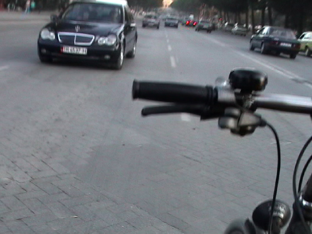 this is just an excerpt.. the video is 4 min. 2003 it is said that about 60 % of all the Mercedes driving in Albania are stolen from Western Europe. The bicycle is not only my unique vehicle of transportation but also my urban eyeglass - some extension of my visual and acoustic organs. As such it is a real social urban interface. When working with my dreams over an 8 months period I realized with surprise that I was dreaming constantly of my bicycle in relationship to the apprehension of my world. I'm a bicycle rider since early childhood. My first birthday present I remember was a bicycle. I have never stayed in a place for long without a bicycle, including in Tokyo where I was harassed daily by the police for riding a bicycle. (I was considered a bicycle thief). Today, 10/23/03, I just had this dream about me bicycling against a crowd of Trachten wearing people. Trachten are the traditional European clothes, associated with traditionalism, 'good old times' and right wing politics. (I m not saying that everybody who wears these clothes does have a right wing agents but many might and do, as do others in contemporary outfits). The last time, I saw a chorus was in Modena for the opening of a group show where Maria Papandropulous invited an Italian chorus - dressed in traditional clothes, lined up in some formation - for some presentation. I really despised the fact that the artist instrumentalized these singers and put them into an uneasy situation where they had to sing songs for a public that basically was making fun of them, that didn't pay any attention, that treated them as if some kind of different species. People stood with the back towards the chorus talking in loud voices while they were singing: "a great piece" .. and other things. I expressed my complaint to Maria. Yesterday, I received an email asking for photographs which I sent to her. She is a great person and we got along very well. In fact I really like her at least as much as I hate this 'conceptual placement'. This might have triggered this dream. During the dream I was bicycling in the same style like in Tirana against the crowds of Trachten wearing lines of people. The police was chasing me and people tried to catch me. Quite a strange nightmare. The bicycle is really - next to the computer and the radio - my most important instrument for 'making it through my life'.