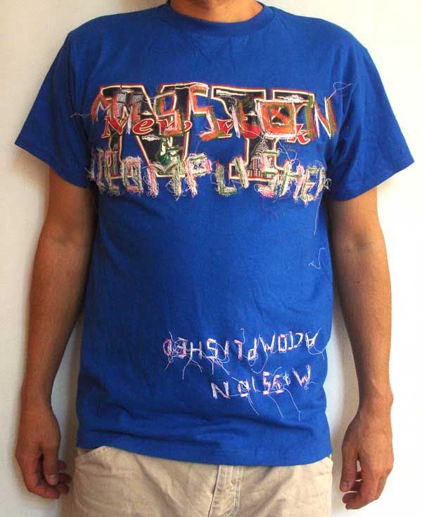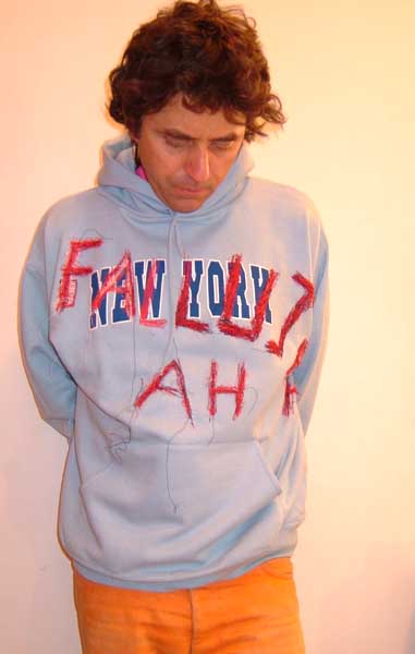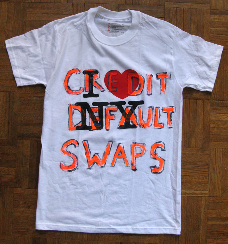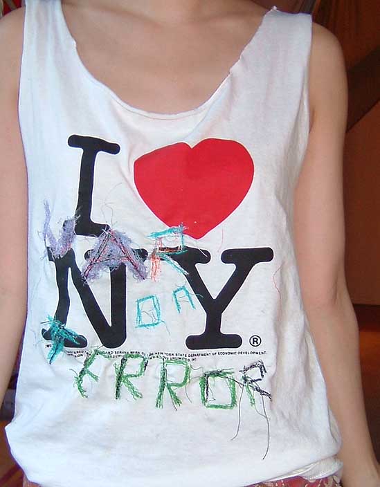 more fasshion >> go to my JEWELRY SECTION Since the early 1990, have been working with Please, teach me Japanese and other Tshirts as part of my art work. 1999, while representing the Austrian Pavillion at the Venice Biennial I produced a piece that consisted of 50 t-shirts entitled: Please, teach me ... 50 languages spoken in countries that don't have any Pavillion at the Venice Biennial. With the arrival of Bush, the artist started to embroider on top of 'I love NY' famous idioms uttered by W. G. Bush: From War on Terror, and Freedom Fries to Water Boarding. With the arrival of the current era of the financial and economic melt down, I’m taking on this new 'nomenclatura' and in a cheaper, less labor intensive way than hand made embroidery: I’m painting all the symptomatic terminology and names associated with the worst of it on the 'I love NY' T-shirts: Securitization, Collateralized Debt Obligation, Credit Crunch, Lehmann Brother, Bernard Bernoff, Subprime Mortgage, Toxic Assets etc…. As with Evil Doer written on a t-shirt it is not always easy to wear them since who wants to have written Bankruptcy or Foreclosure on his/her breast? IF YOU ARE IN THE USA.. YOU CAN GET IT FOR 200 DOLLARS.