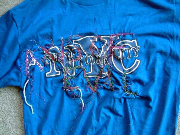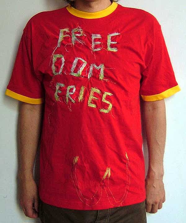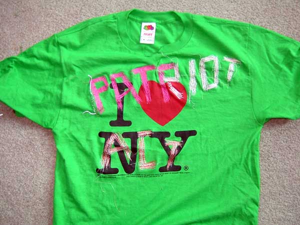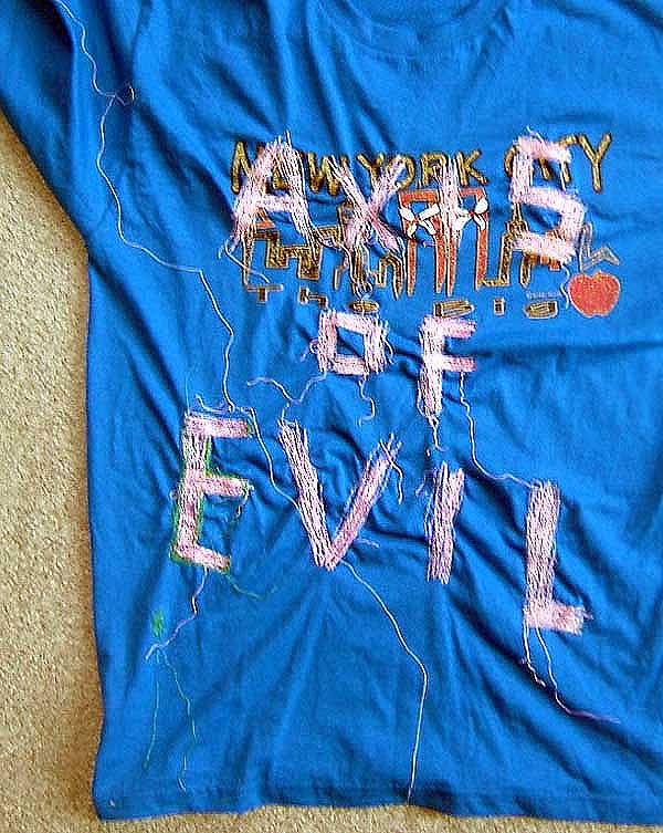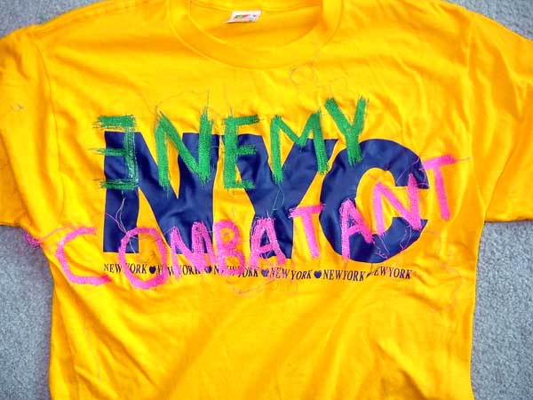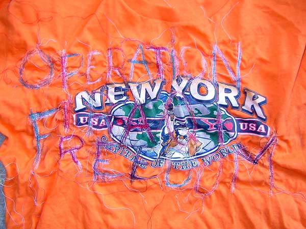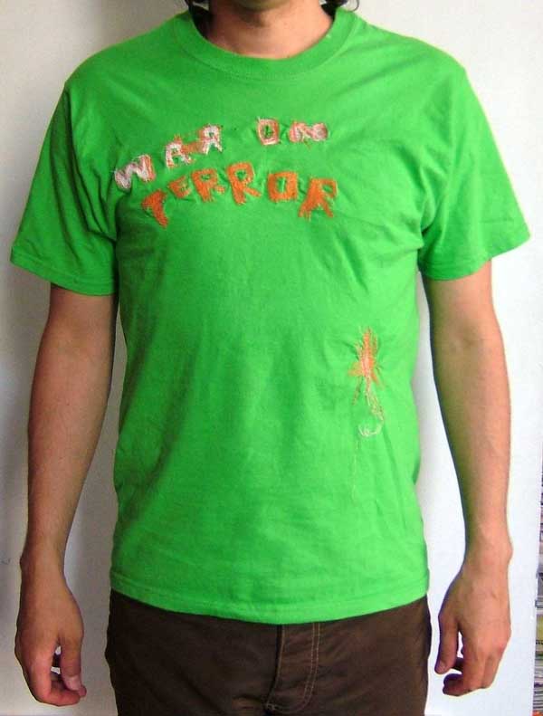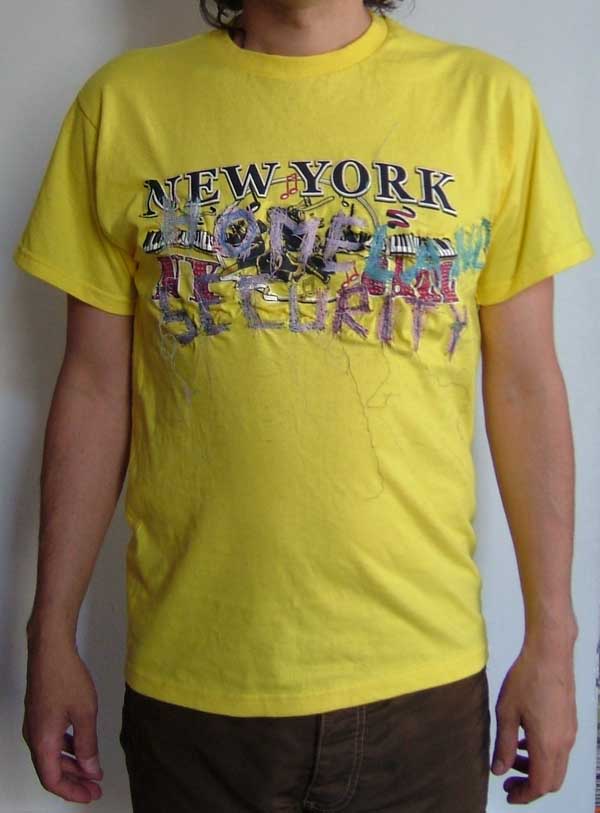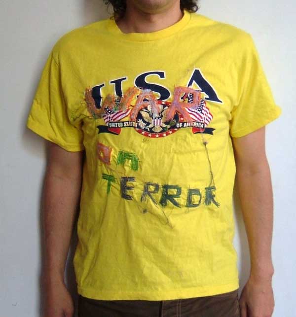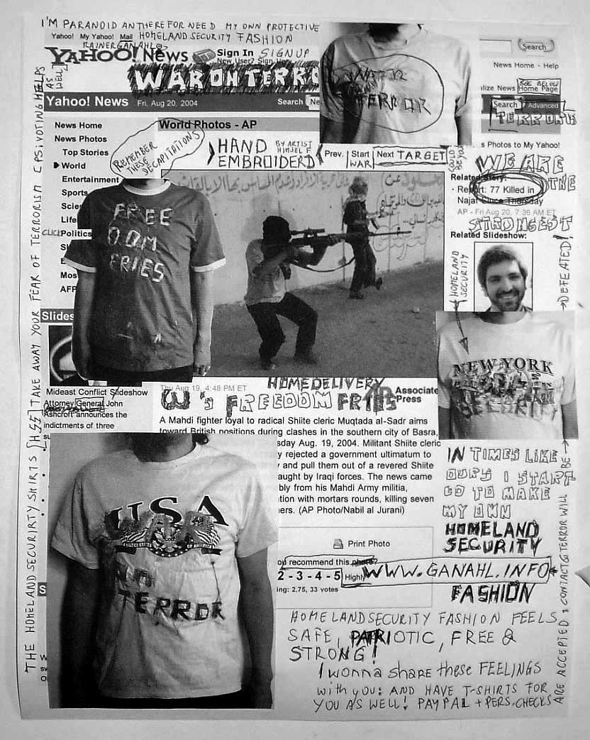 WELCOME TO HOMELAND SECURITY FASHION IF YOU WANNA DRESS SAVELY TM these t-shirts are hand made by me../ embroidered/ (as you can tell quickly) and are to be seen in relationship wth my "war on terror" drawings, and the "stamps") (people ask me "how much" and since I don't say NO to E-commerce, I have set a price: 300 US $ - you could pick one from here /some are gone or I keep for myself / or you can order an individual t-shirtsmade for you - you chose the T-shirt /t-shirt style, color, size, what's underneath - and the sentence - see: here ) - made by the artist! some images have hi res. attached.