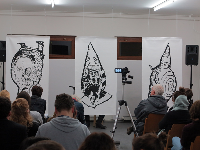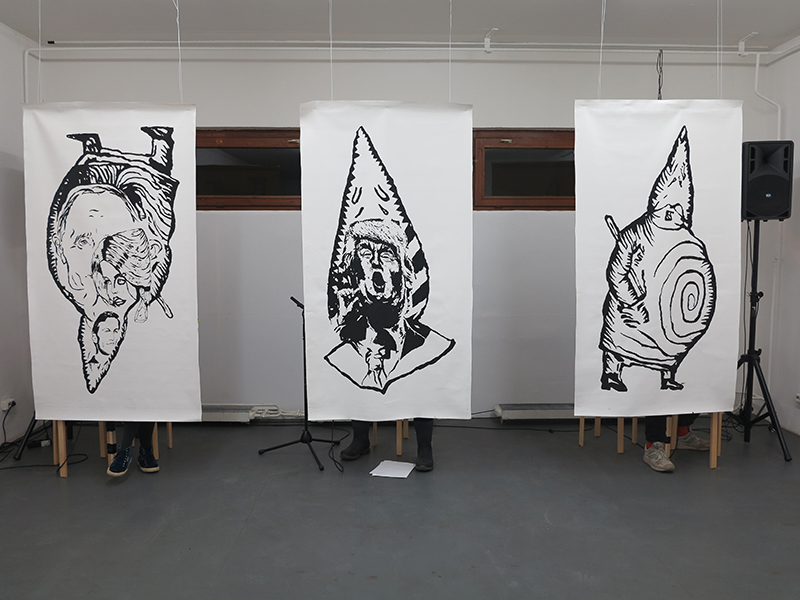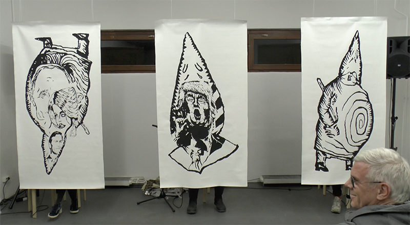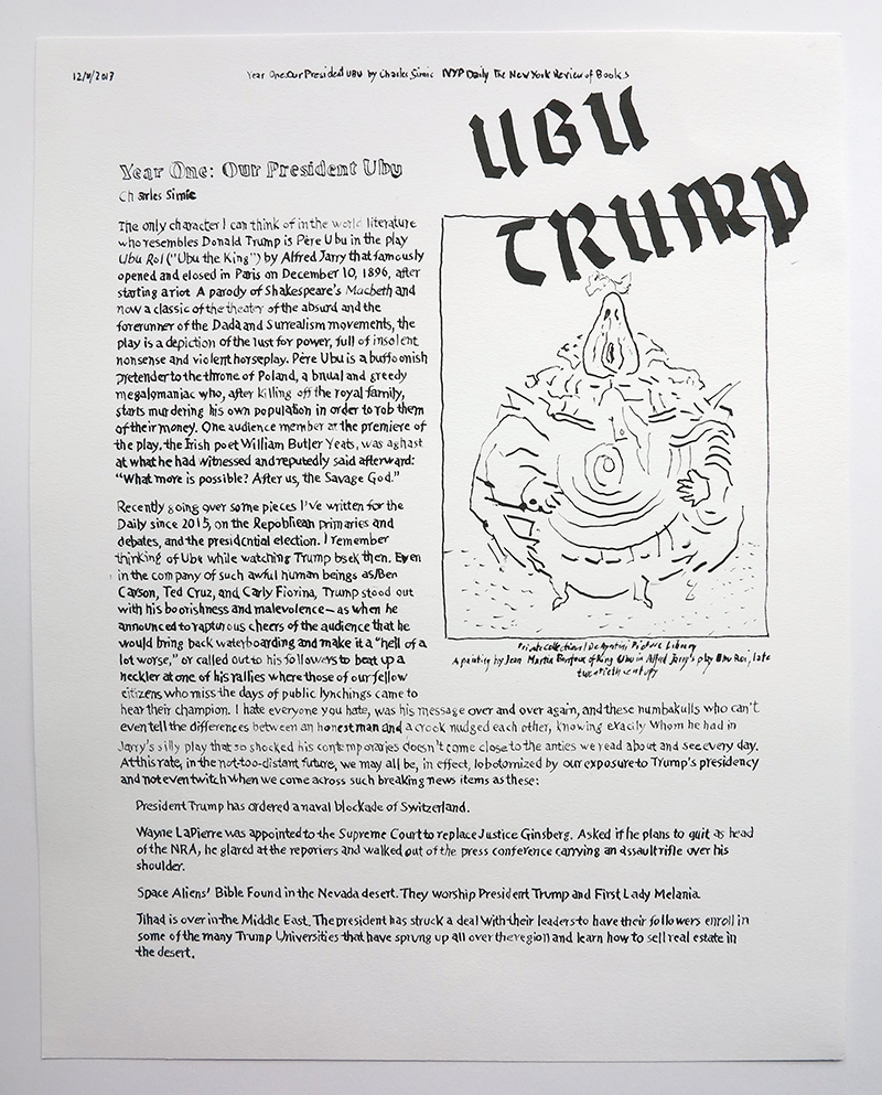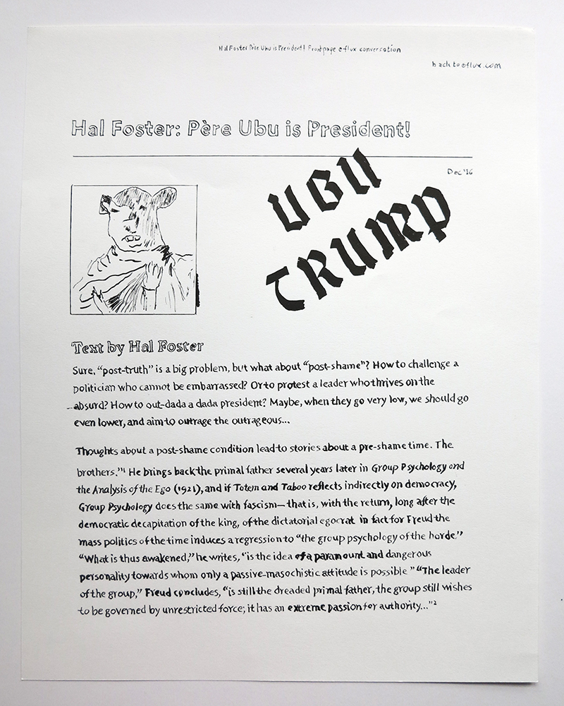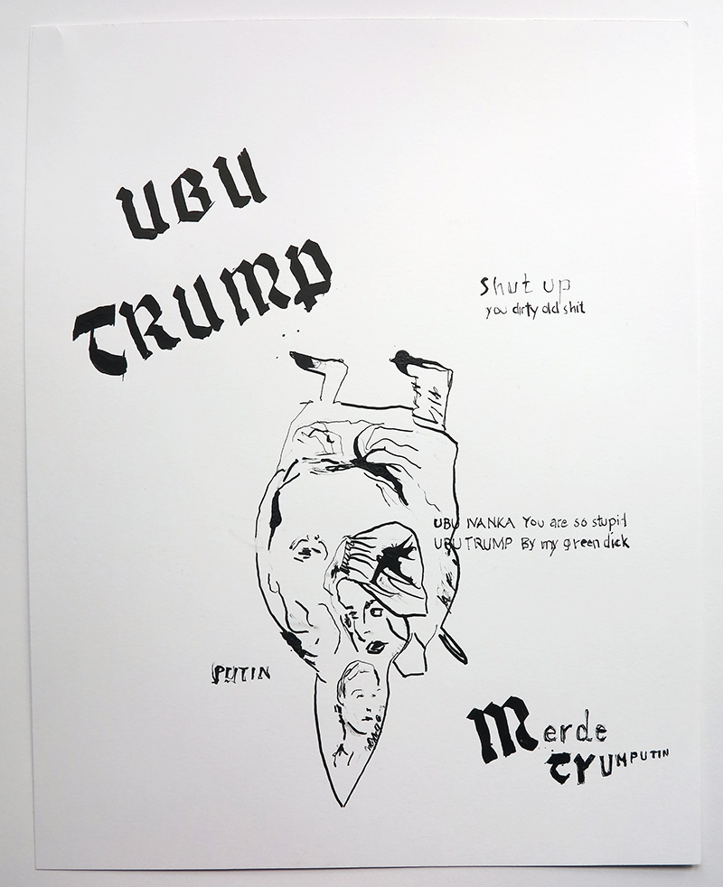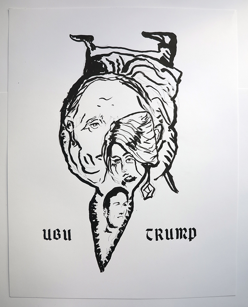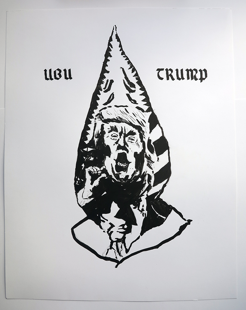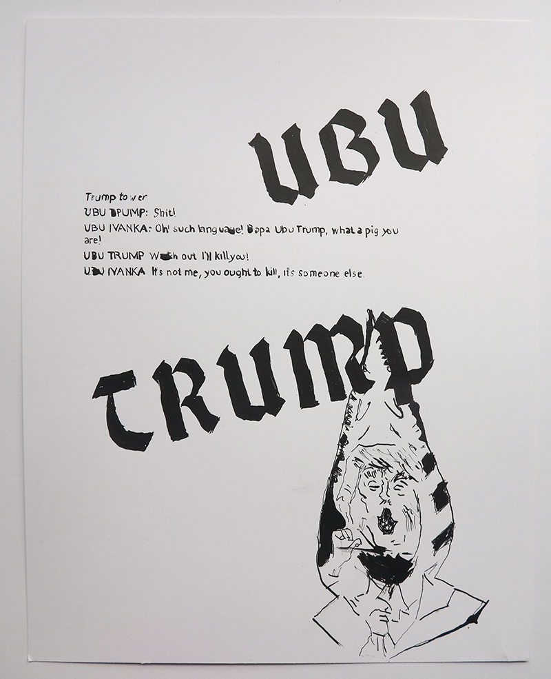 UBU TRUMP Alfred Jarry first presented his absurdist, expletive-filled play King Ubu in Paris in 1896, and instantly ignited a literary scandal. King Ubu not only influenced artistic movements such as Dada, Surrealism, and the Absurd Theater of Jean Genet and Samuel Beckett, but it anticipated, with frightening perspicacity, the catastrophic political madness of the 21st century. Written in a rudimentary and comically nonsensical way—it even incorporates some of Jarry’s high-school stunts—the play lends itself to updating with contemporary slang and subjects. About 10 years ago, Rainer Ganahl rewrote Jarry’s text as Ubu Lenin, with Vladimir Lenin and his wife Nadezhda Krupskaya as the protagonists. Now, the advent of Donald Trump has presented an even more appropriately divisive, madcap, narcissistic stand-in for King Ubu. Ganahl's Ubu Trump will take place in Harlem, a neighborhood filled with many of the very people Trump supporters would like to see deported, banned, or put behind “big, beautiful walls.” Just like Jarry’s King Ubu, Trump and his cronies run their administration like a mafia family business, with barely fig-leafed personal enrichment schemes layered upon corrupt policies and, in all likelihood, treason. In Ubu Trump, the father, King Ubu, has been replaced with Ubu Trump, while Mama Ubu is reincarnated as Ubu Ivanka. Originally set in Poland and Russia, the new play blends Warsaw with Washington, and Poland with the USA, alluding to Trump's special dealings with Putin and the new right-wing government in Poland. The actors perform behind three simple graphic panels based on Jarry's own sketches of King Ubu, and overlapped with renderings of the ruling Trump family: Donald, Ivanka, Jared, and their Russian guest, Putin. This theatrical performance will be staged at a morgue in Harlem, the neighborhood where Ganahl has been living for more than 20 years.